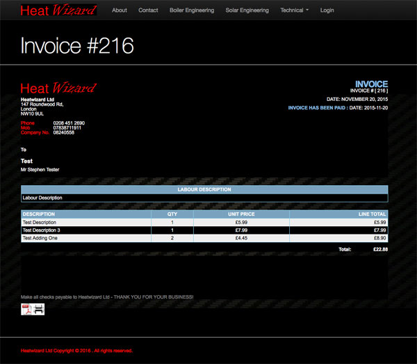 The responsive site enables the company to create invoices that can then be accessed by the clients. The invoices and client details are managed from the administrative side.