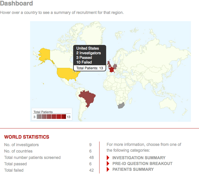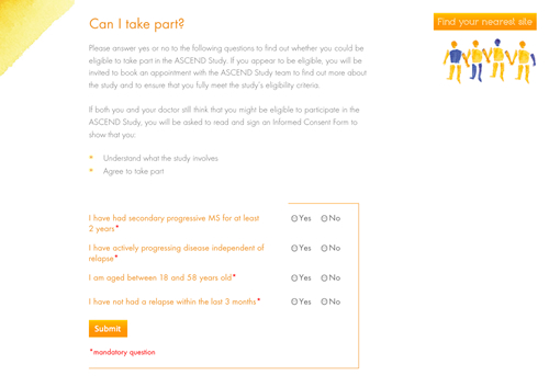 A drupal 7 multilingual site that captures users responses to questions. The site also uses a google map to display the locations of the clinics within the trial.